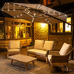 The revolutionary Orion Cantilever Parasol offers everything you could want from premium outdoor shade. Easy to operate and fully adjustable both vertically and horizontally, it provides an impressive 72 position settings and rotates a full 360 degrees via its sturdy metal footplate. The robust aluminium frame supports a UV50+ removable canopy and is enhanced with integrated star lights?powered by a rechargeable battery and spare, complete with a charge-level display and the ability to charge your phone or vape. Thoughtful quality touches include taped seams at the rib ends and convenient clips for hanging lights or decorations. A weighted base is included for added stability. Available in both round and square designs, the Orion comes in a range of colours, including options that perfectly complement the entire KETTLER furniture collection?making it as stylish as it is innovative. An easy to assemble protective cover is also included.